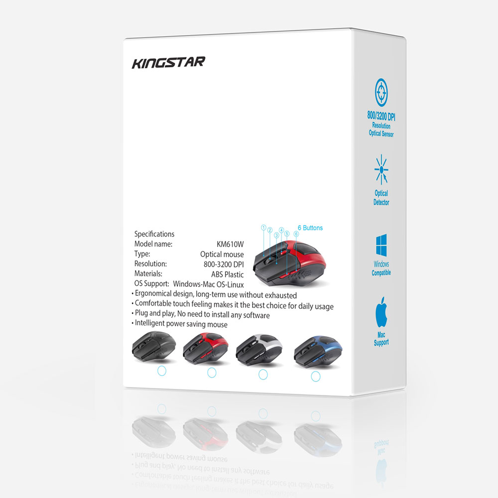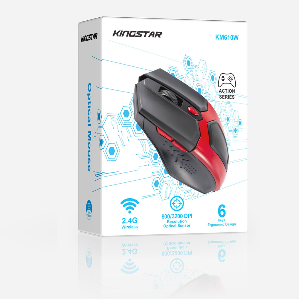 ماوس بیسیم کینگ استار مدل KM610W با طراحی زیبا و رنگ بندی جذاب به بازار عرضه شده است که میتوانیدبه راحتی رنگ دلخواه خود را انتخاب کنید. تعداد کلیدهای تعبیه شده روی این ماوس محصول کمپانی کینگ استار 6 عدد است و از دقت 3200-800 dpi بهره میبرد.