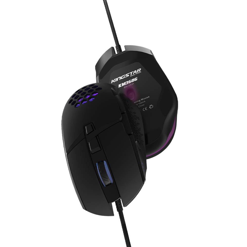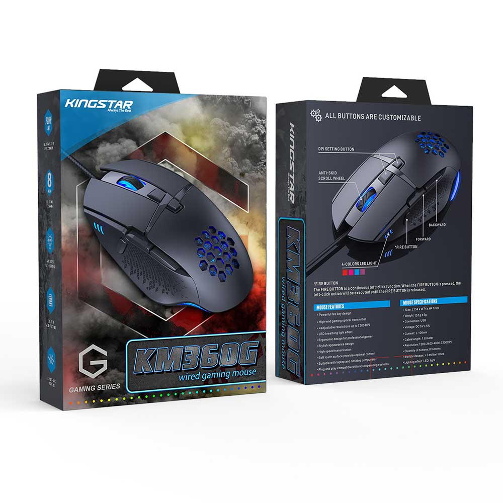 ماوسهای گیمینگ از پرطرفدارترین محصولات کمپانی کینگ استار است که با تکیه بر زیبایی و جذابیت در طراحی به بازار عرضه گردیده است. ماوس گیمینگ کینگ استار مدل KM360G با 180 سانتی متر طول کابل و جنس کنفی آن که از طریق پورت USB به سیستم متصل میگردد، امروزه مورد استفاده کاربران زیادی قرار گرفته است. از مشخصههای فنی این ماوس میتوان به مقدار جریان 100 میلی آمپر و ولتاژ 5 ولت آن هنگام استفاده، اشاره کرد.