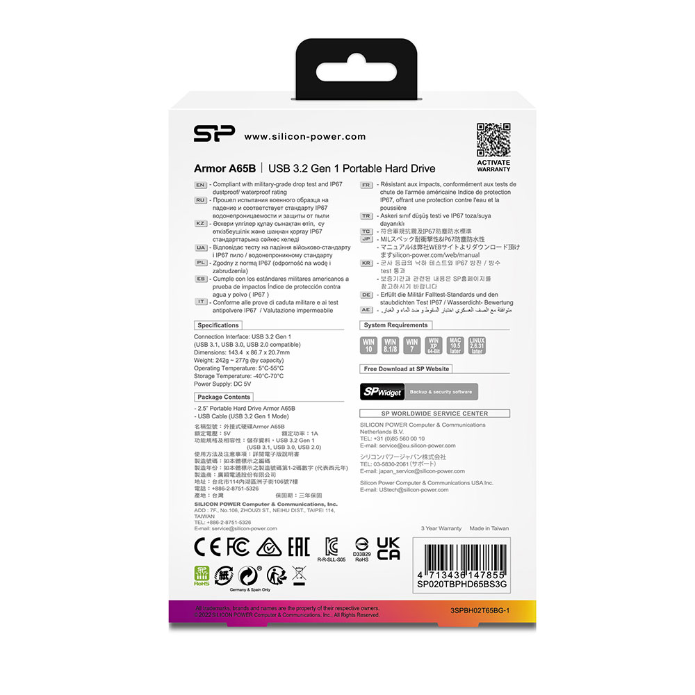 هارد دیسک Armor A65B سیلیکون پاور از نظر مقاوت در سطح بسیار بالایی قرار دارد. این هارد به استاندارد نظامی MIL-STD 810G مجهز است که یعنی سلامتی آن در صورت سقوط از ارتفاع ۱۲۲ سانتی متری آن هم با ۲۶ سطح تماس با محل برخورد، تضمین شده است. این مدل همچنین گواهینامه IP67 برای مقاوت در برابر نفوذ آب و گرد و خاک را دارد. داشتن این گواهینامه یعنی هارد یاد شده میتواند تا ۳۰ دقیقه در عمق۱۰۰ سانتی متری آب دوام بیاورد.