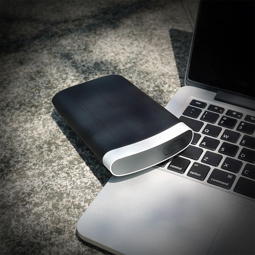 یک نوار پلاستیکی نقرهای رنگ در جلوی هارد قرار گرفته که در پشت آن، اطلاعاتی مثل شماره سریال و ظرفیت هارد حک شده است. چراغ نشانگر فعالیت هارد نیز در جلوی آن قرار گرفته است و در پشت هارد، بخشی از پوشش سیلیکونی برش خورده تا بتوانید موقع جابه جا کردن هارد، سیم را در آنجا قرار دهید.